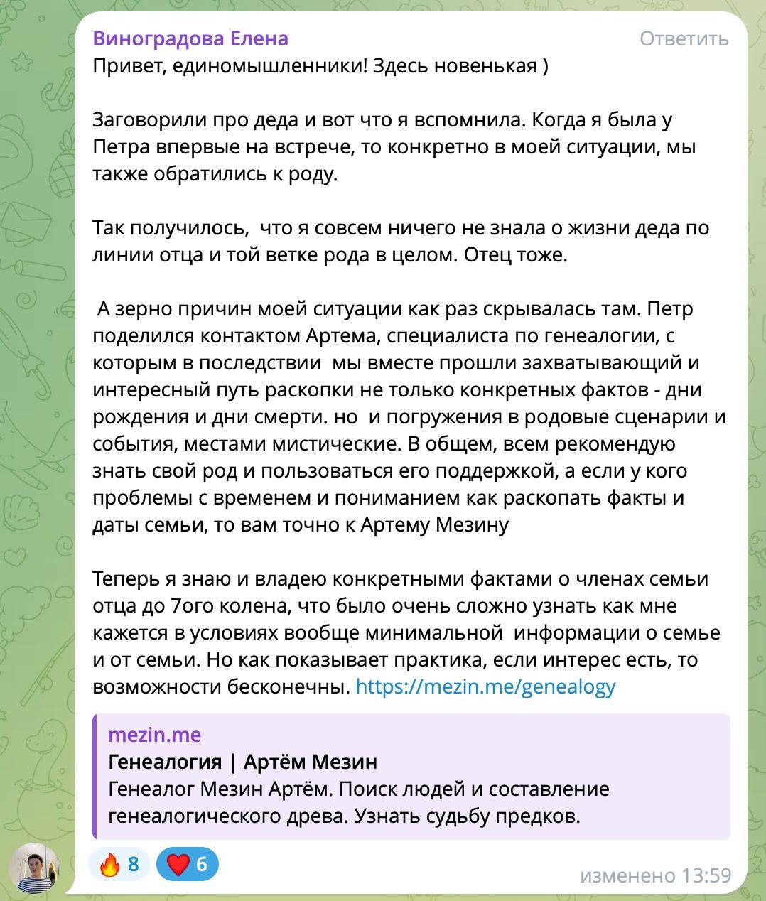 С этого момента генеалогия перестала быть для меня личным поиском и стала практикой. Я начал помогать другим, сначала неформально, затем в формате запросов. К концу 2021 года в моём дереве было более 1500 персон, а в 2022 появился первый платный заказ.